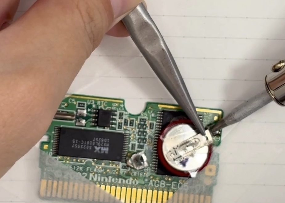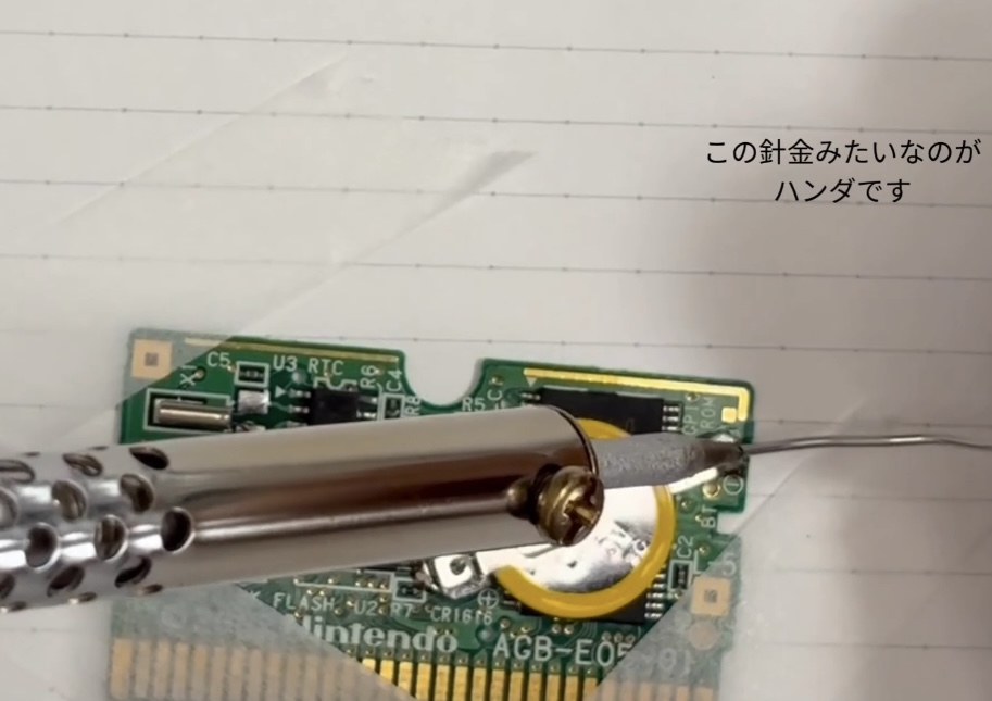 ❸ ピンセットとハンダごてを使って、リチウム電池を外します。(ハンダごてを使います)