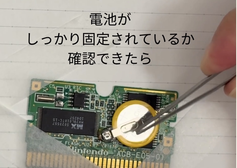 ハンダとハンダごてで接着できたあと、ピンセットなどで電池が固定されているか確認できたら。。。